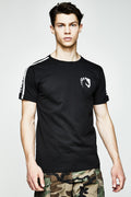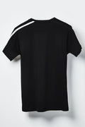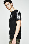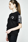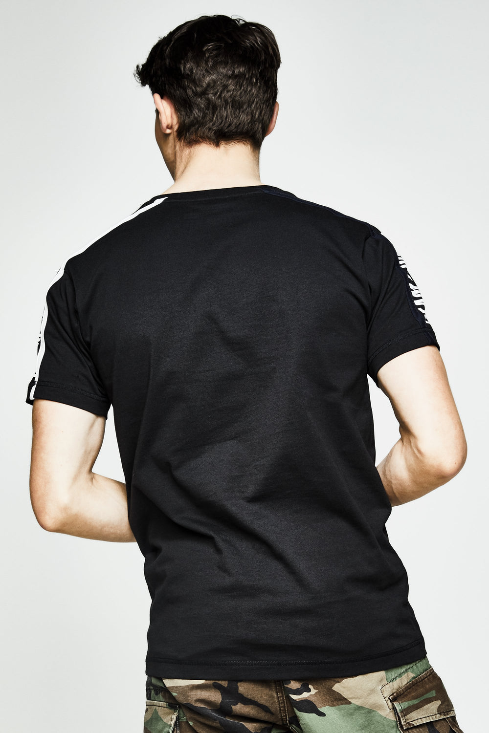 Taking cues from sports heritage, the Taping Tee features a contrast asymmetrical look that frames the shoulders and forms a strong silhouette.